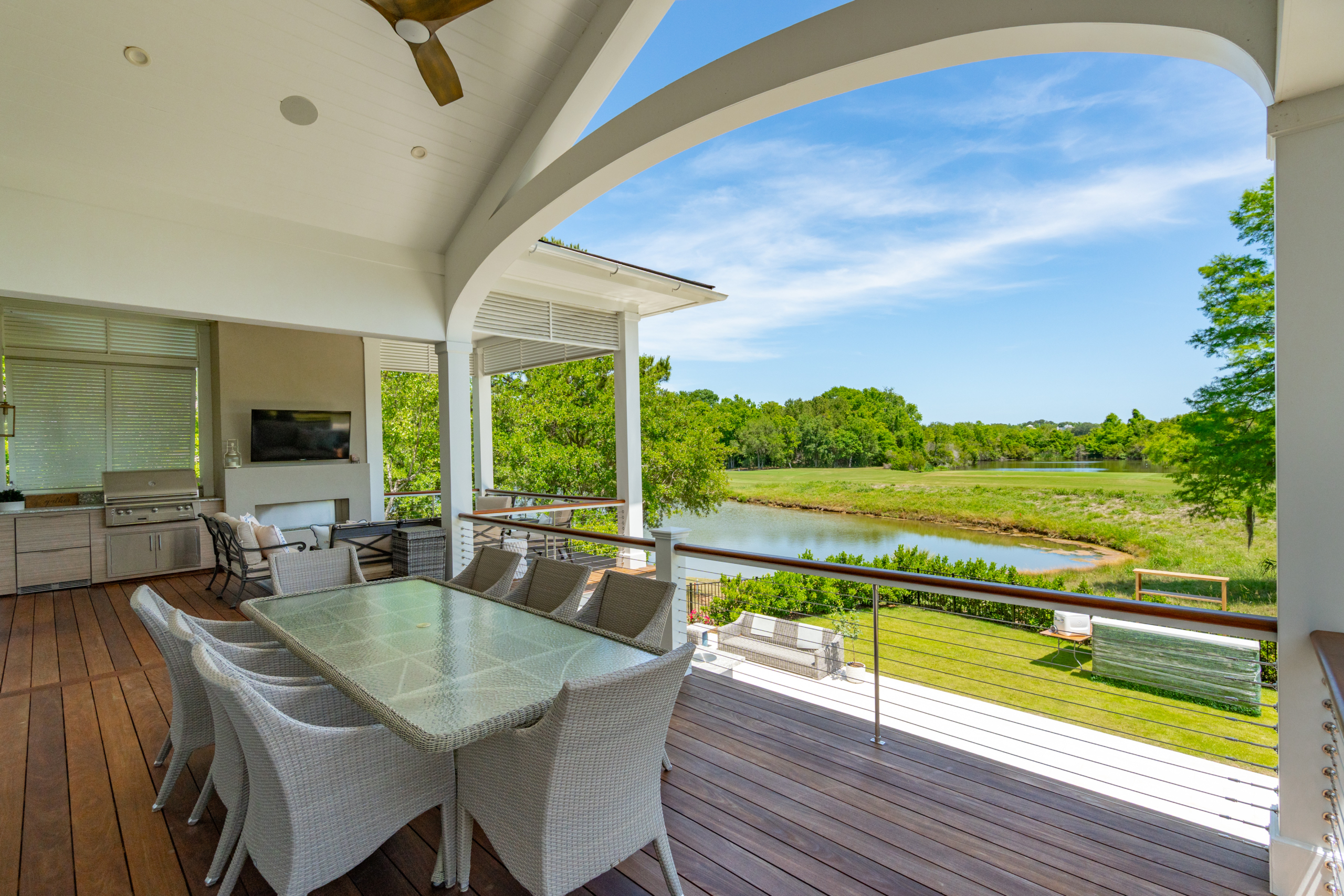 Inside, an open floor plan creates an easy connection between the gourmet kitchen and the bright living area, where a statement fireplace and custom built-ins add both function and character. French doors extend the living space outdoors to a screened porch, complete with an outdoor kitchen and grill area, and a cozy fireplace overlooking a backyard designed for year-round Lowcountry entertaining. Situated on the golf course offers beautiful open views year round from interior and exterior of the home.